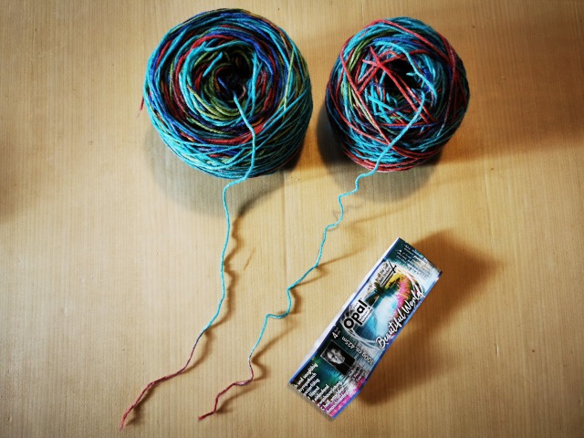 染めのリピートを探して毛糸をふたつにわけ、左右の柄を合わせることにチャレンジすることにした。