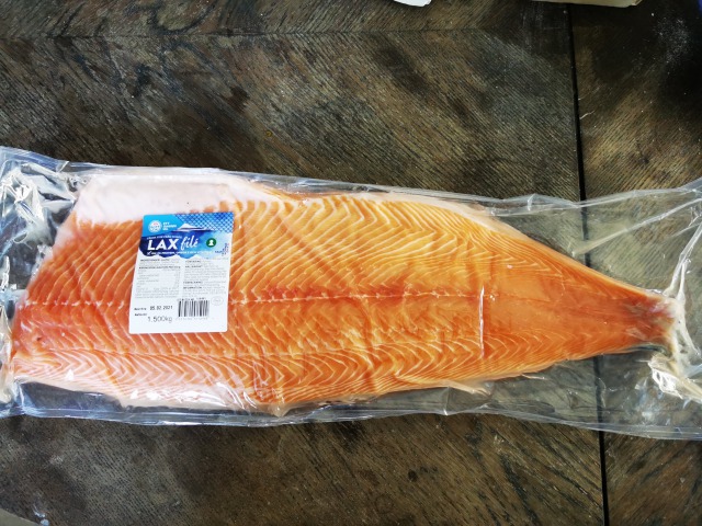 サーモン半身(1~1.5Kg)がお買い得になっていたので、チャンスは逃さない。