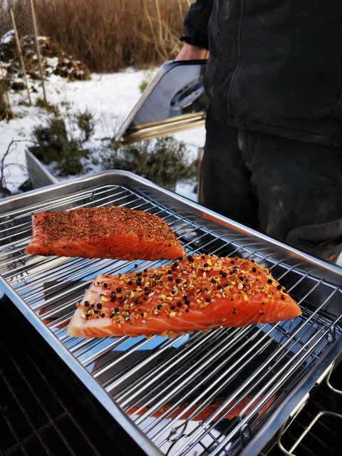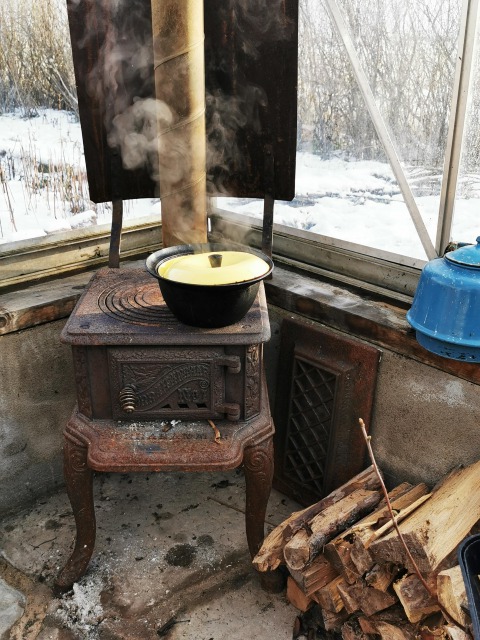 40分くらいスモークする間に、温室でアルコールフリーのホットワインを飲んだり、ボルシチを煮込んだり。