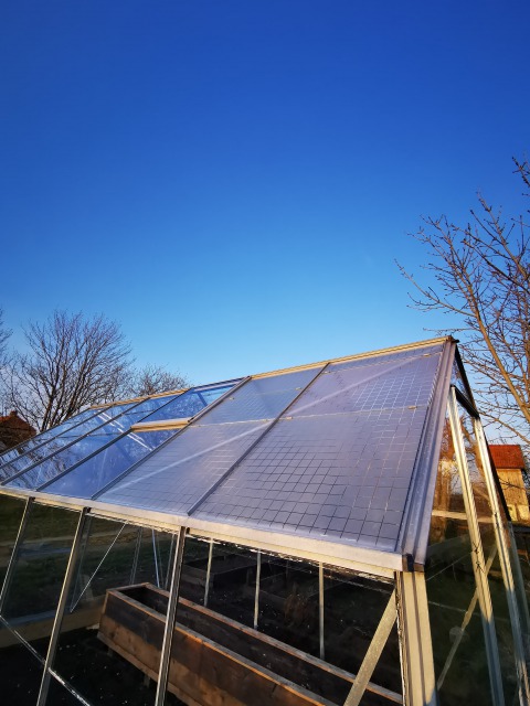 ふたつめの温室 その2)ガラスを切ってはめる&日よけ対策