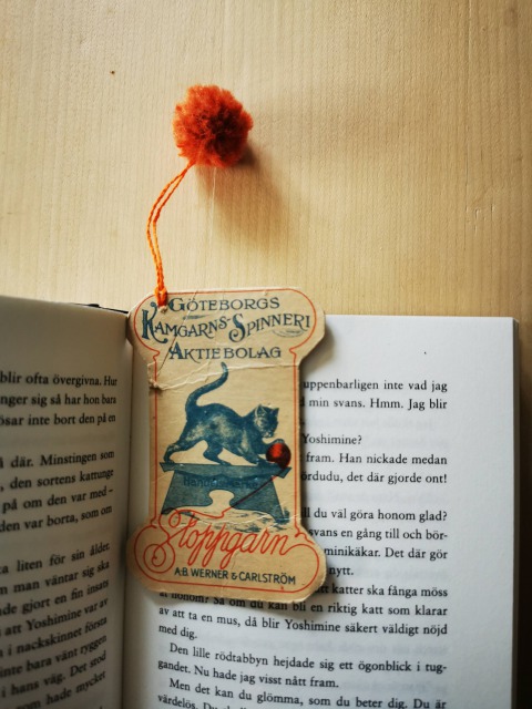 糸が巻いてあった猫柄の台紙 (クシャクシャなのが残念) を使ってしおりをつくってみました。